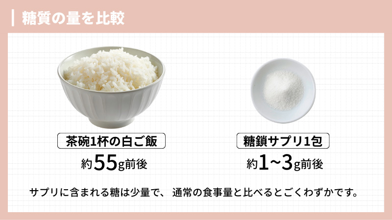 まず、食事(白ご飯)で摂れる量・サプリで摂れる量を比較すると、その差がわかります。サプリから摂れる糖の量はとても少なく、極端な食事制限をしていなければ、サプリを摂っても摂らなくても、全体の糖の量は大きく変わりません。
