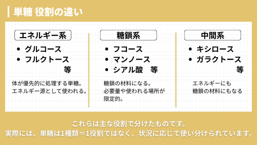 フコースやシアル酸、Nアセチルグルコサミンなど、血糖値を上げる目的で使われない「単糖」もあるのです。これらは、糖鎖の材料となり、体の中で使われる場所が限られています。つまり、同じ「糖」でも体での使われ方や役割が異なり、全く別のものであるということです。